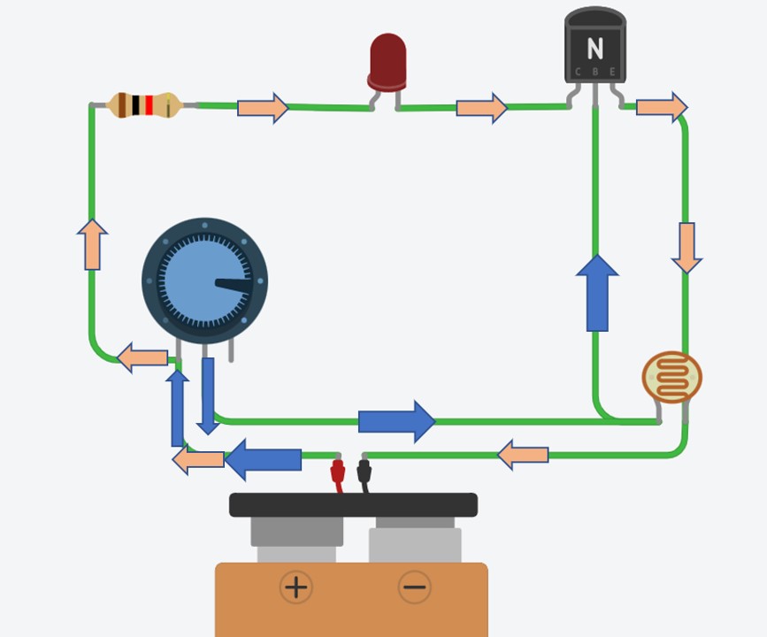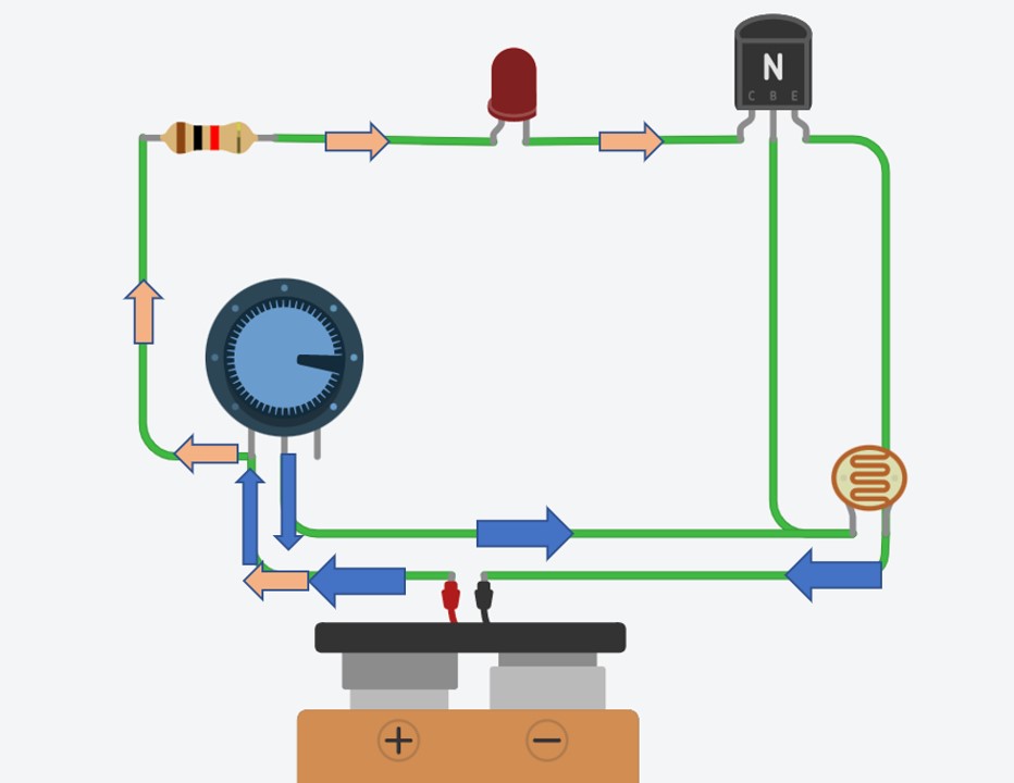 Blue arrows represent the current that activates the transistor. Pink arrows represent the current that activates the lamp. Notice that no current passes through the LDR.