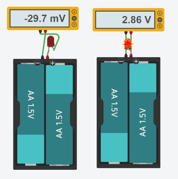 do not close a circuit without load. Connect a low-resistance component directly to the power source to avoid burning things up.Open: