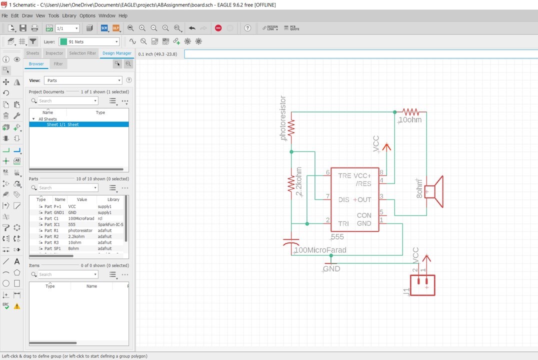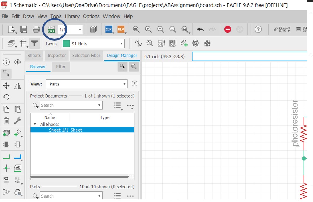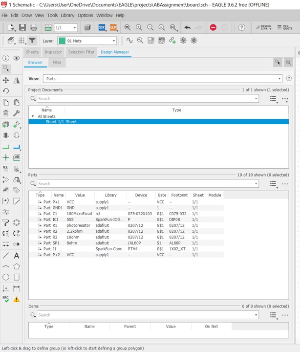 To electronically represent this sketch, we need to insert Eagle components and do the wiring through the software. Here is a quick tutorial on how to add and wire different parts of your sketched circuit.